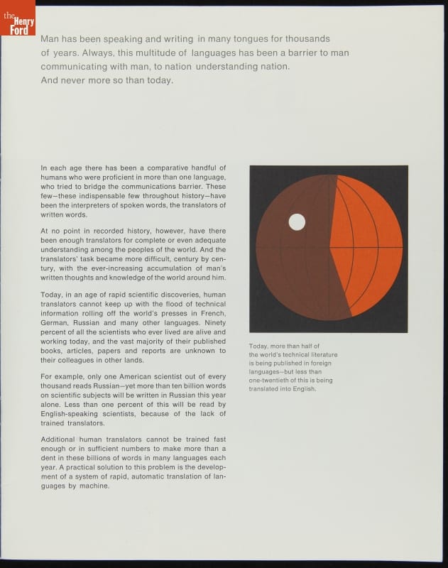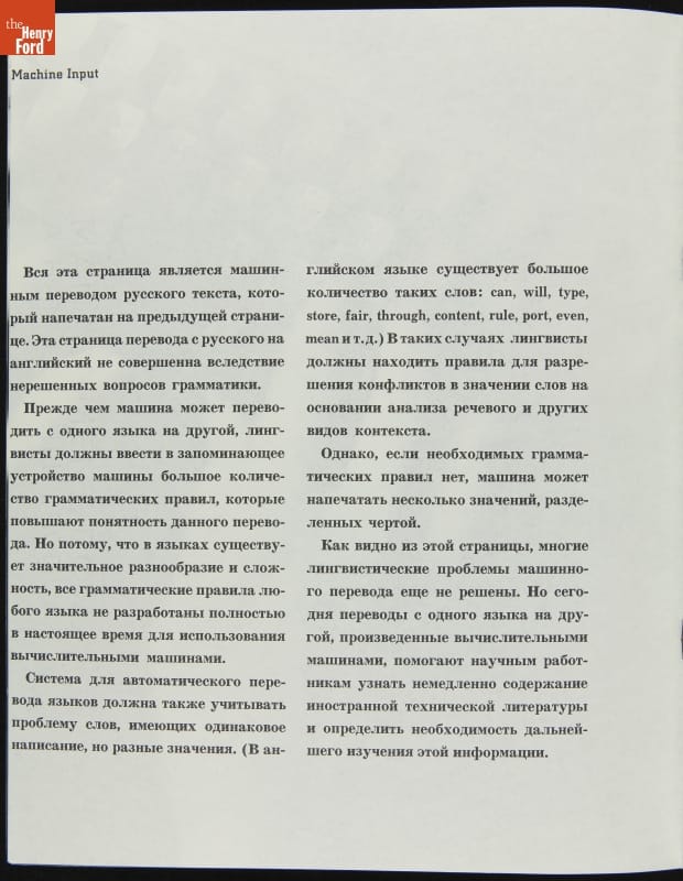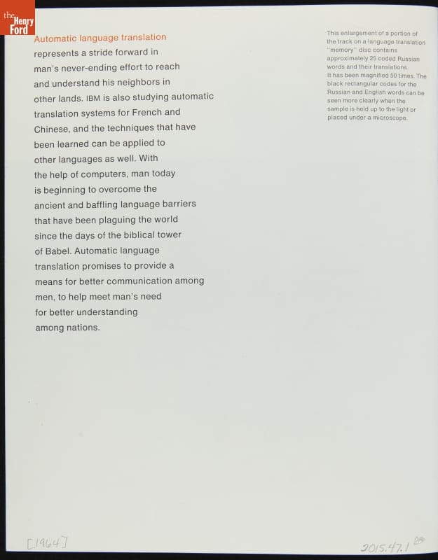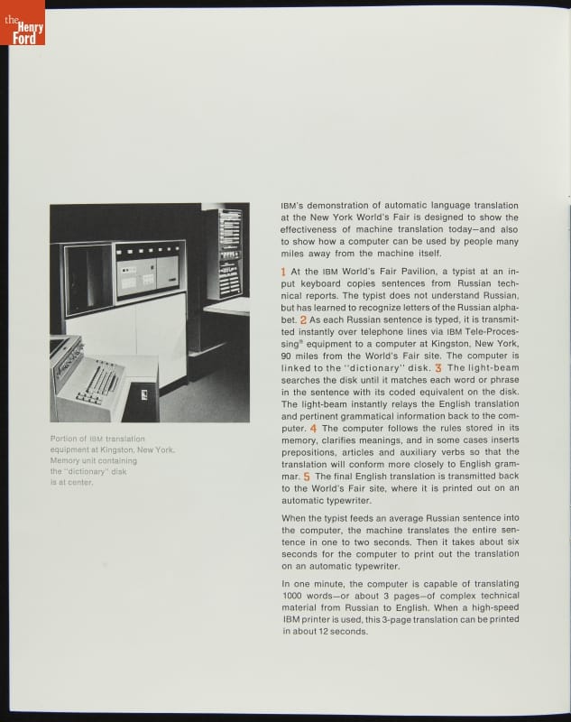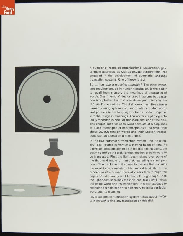 At the 1964 World's Fair, IBM debuted their Automatic Language Translator. This computer held a high-speed optical "dictionary disk" with 170,000 words in English and Russian. IBM hired typists to input Cyrillic characters on a keyboard, triggering a beam of light to search the dictionary disc for an English counterpart. Translations were produced at 1000 words per minute.