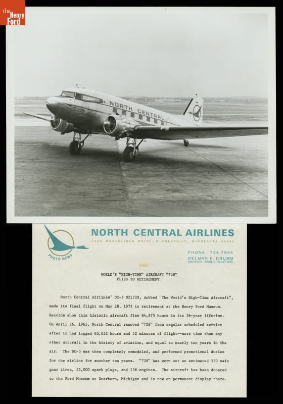 By the time it was retired to Henry Ford Museum in 1975, North Central Airlines DC-3 number N21728 had logged nearly 85,000 flight hours, setting a record for a commercial aircraft. The plane, built in 1939, carried passengers for Eastern Airlines until North Central bought it in 1952. At its retirement, the DC-3 was being used for VIP transportation.
