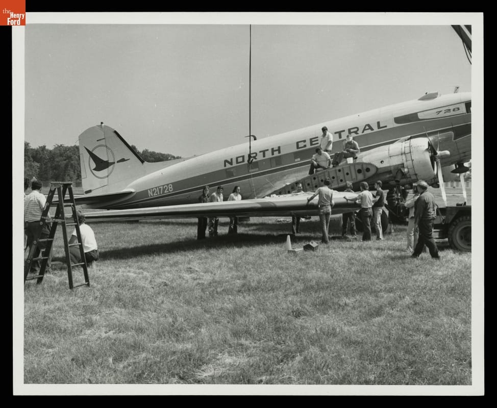 North Central Airlines donated a Douglas DC-3 airplane to The Henry Ford in 1975. After the plane flew to Ford Motor Company's proving ground -- first developed as an airport in 1924 -- its wings were removed and the aircraft was transported by crane to Henry Ford Museum. It was reassembled and displayed outside the museum until moved indoors in 2003.