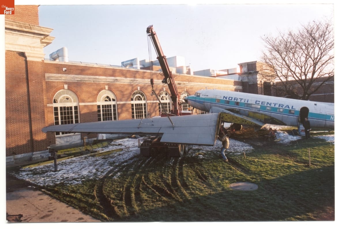 The Henry Ford acquired its Douglas DC-3 airplane in 1975. Due to its size, the plane initially was displayed outside Henry Ford Museum. In 2002, the plane was disassembled and thoroughly conserved to correct the effects of 27 years of weather exposure. The treated DC-3 was reassembled for display inside the museum in 2003.