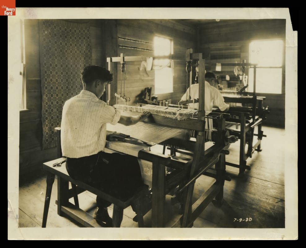 Henry Ford believed in "learning by doing." Students enrolled in the Edison Institute Schools located on the grounds of Ford's Greenfield Village had ample opportunities for practical, hands-on training. Students, if they desired, could learn to weave. Beginners used small tabletop looms. As they progressed students created woven materials using larger looms located in Greenfield Village's Plymouth Carding Mill and Weaving Shed.