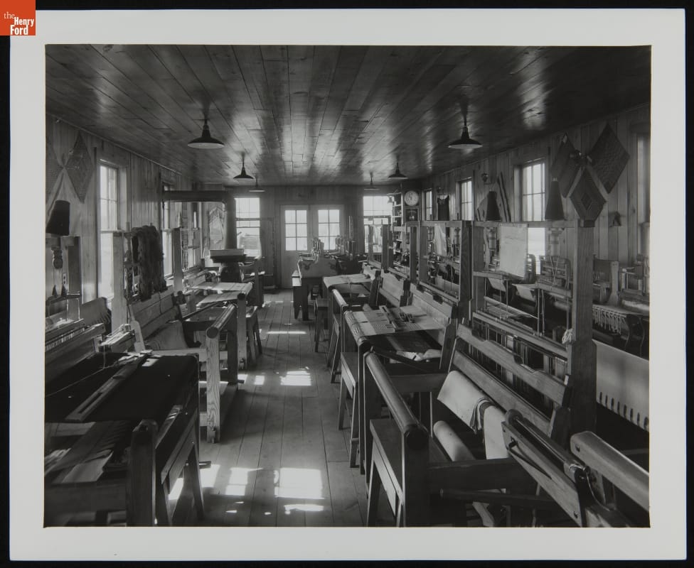 Henry Ford believed in "learning by doing." Students enrolled in the Edison Institute Schools located on the grounds of Ford's Greenfield Village had ample opportunities for practical, hands-on training. Students, if they desired, could learn to weave. Beginners used small tabletop looms. As they progressed students created woven materials using larger looms located in Greenfield Village's Plymouth Carding Mill and Weaving Shed.