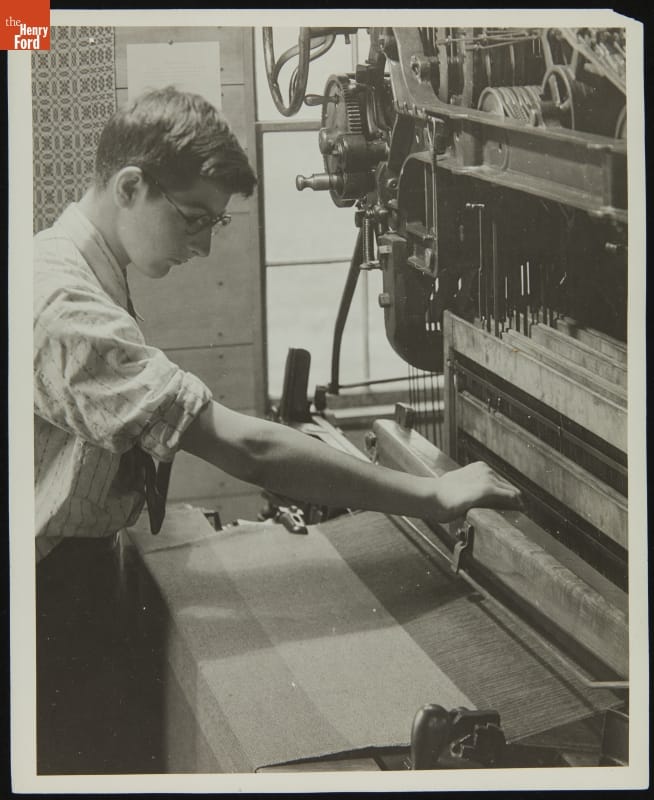Young Man at Power Loom in Plymouth Carding Mill (now Gunsolly Carding Mill), Greenfield Village, circa 1935