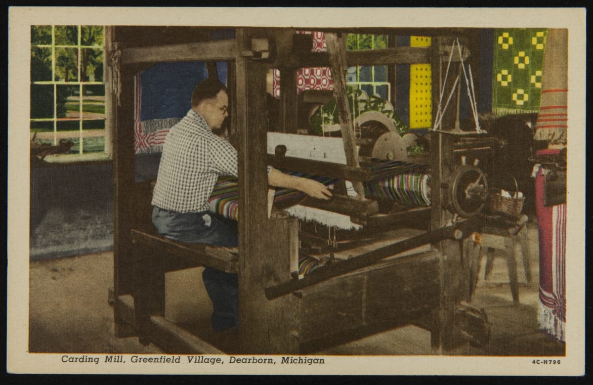 Craftspeople have presented weaving demonstrations at Greenfield Village since it opened to the public in 1933. Over the years, weavers have used several historic and refurbished looms located in the Plymouth Carding Mill (now Gunsolly Carding Mill) to create hand-crafted textiles. These presentations and resulting products help tell the story of textile production in America.