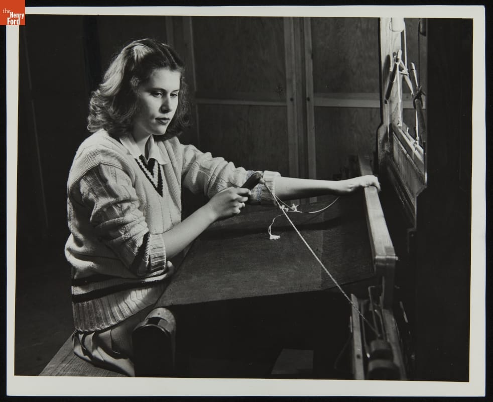 Henry Ford believed in "learning by doing." Students enrolled in the Edison Institute Schools located on the grounds of Ford's Greenfield Village had ample opportunities for practical, hands-on training. Students, if they desired, could learn to weave. Beginners used small tabletop looms. As they progressed students created woven materials using larger looms located in Greenfield Village's Plymouth Carding Mill and Weaving Shed.