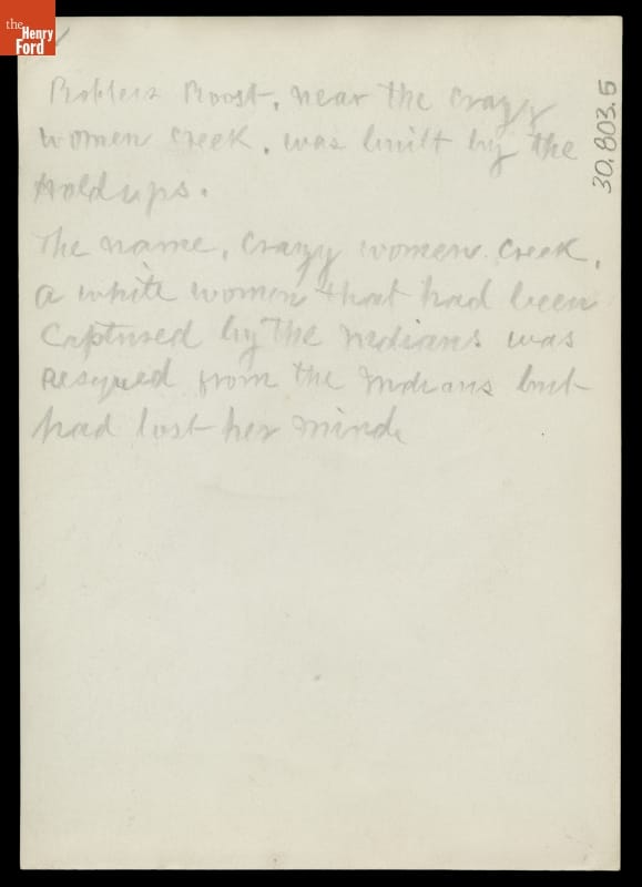 Robbers Roost, near the Crazy Woman creek, was built by the holdups. / The name, Crazy Woman Creek, a white woman that had been captured by the Indians was rescued from the Indians but had lost her mind.