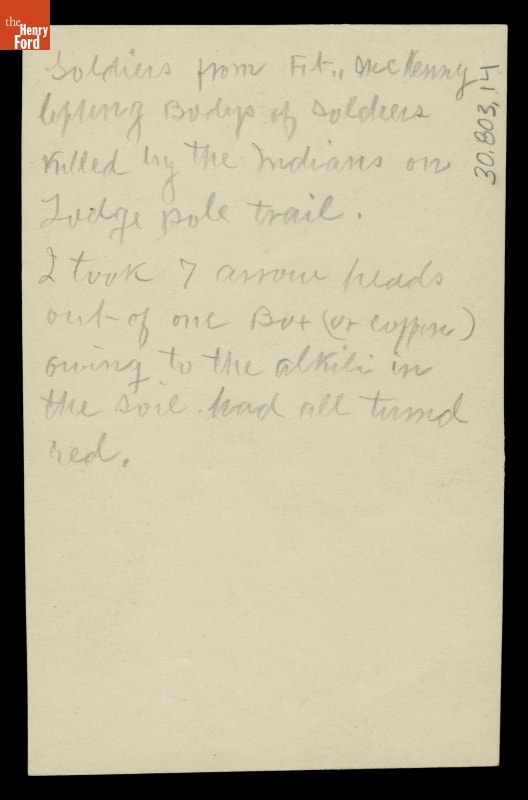 Soldiers from Ft. McKenny lifting bodys [sic] of soldiers killed by the Indians on Lodge Pole trail. I took 7 arrowheads out of one box (or coffin) owing to the alkili [sic] in the soil had all turned red.