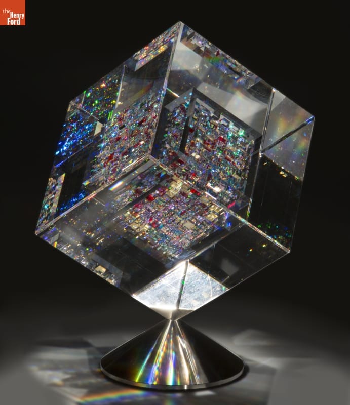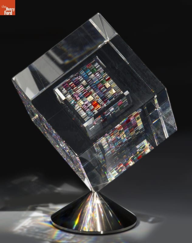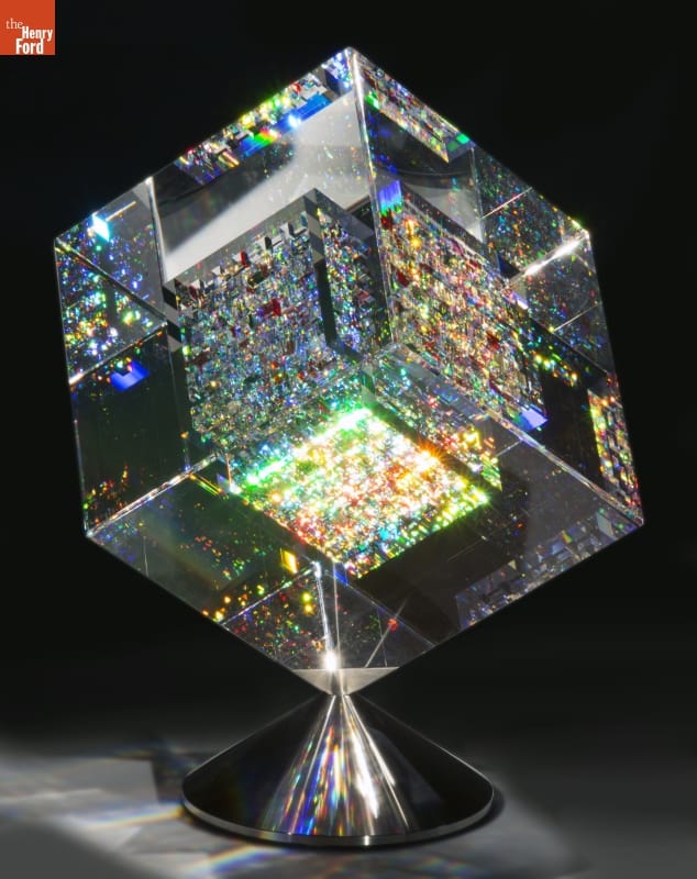 Jon Kuhn's diamond-like, dazzling glass cubes earned him world-renown. Unlike many other studio artists who work with molten glass, Kuhn works only with cold glass. These complex artworks are extremely labor intensive; each piece is cut, polished, and laminated to create an environment that pulls the viewer into a glittering world of color and light.