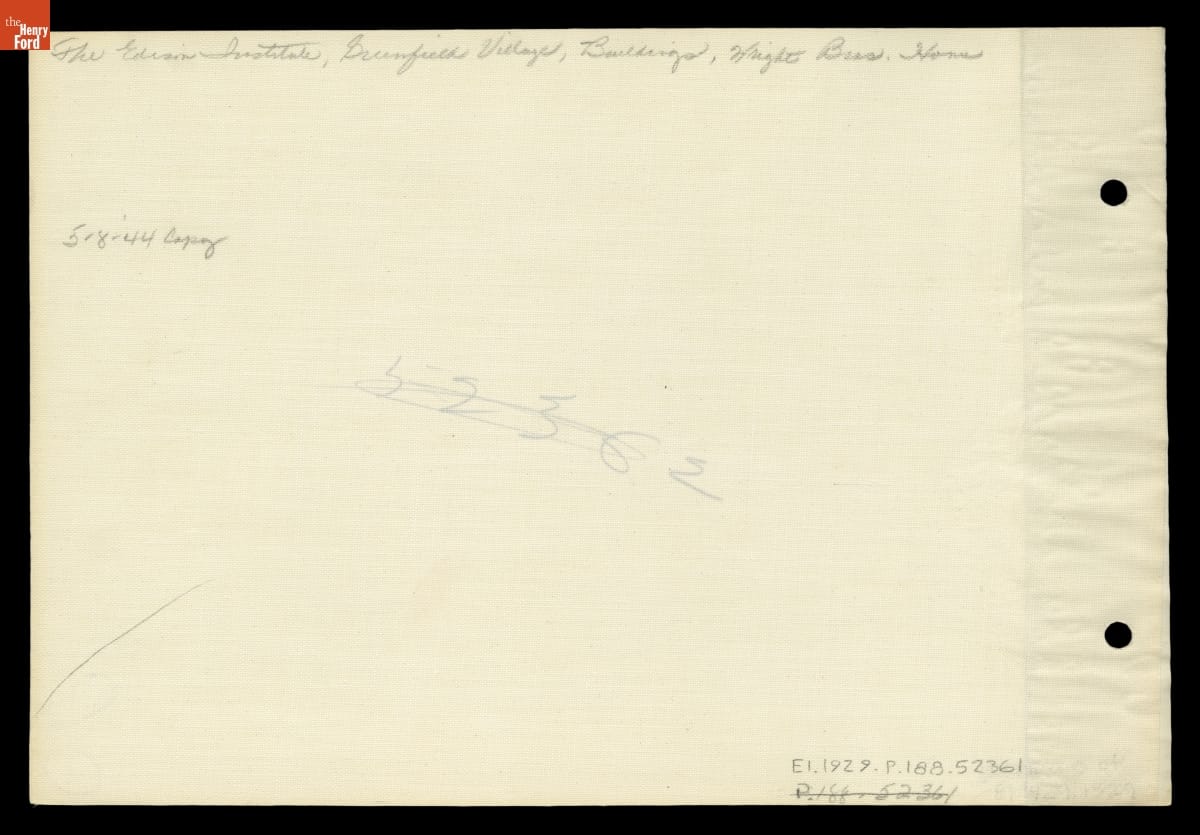 Before moving the Wright Home from Dayton, Ohio, to Greenfield Village in November 1936, Henry Ford's agents found and took detailed photographs of the building's exterior. These photos helped the team reassemble the structure in Dearborn, Michigan. Orville Wright also assisted to ensure the reconstruction's accuracy.