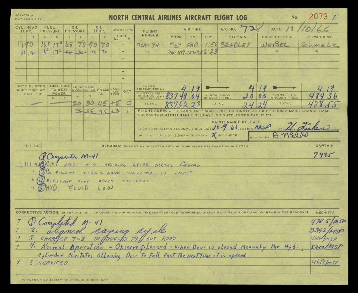 Airplanes require careful maintenance, and each flight must be thoroughly documented in a logbook. This log, for a 1966 flight by Douglas DC-3 N21728, records everything from crew members' names, to flight times, to the operating temperatures of the engines' cylinder heads. Equipment problems and subsequent corrective actions are noted as well.