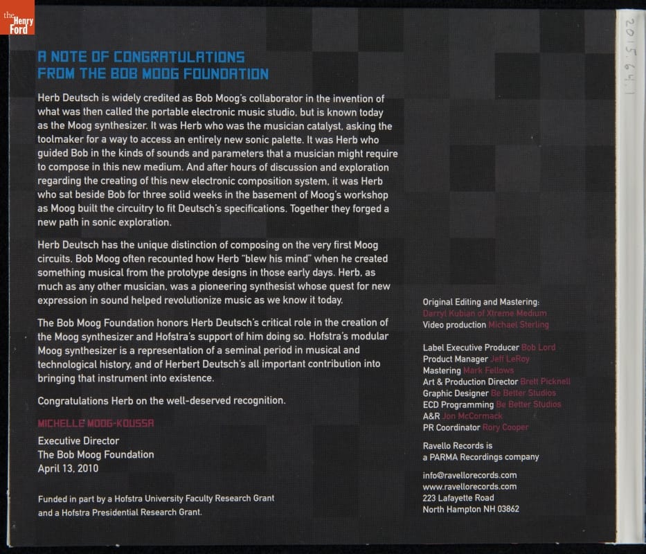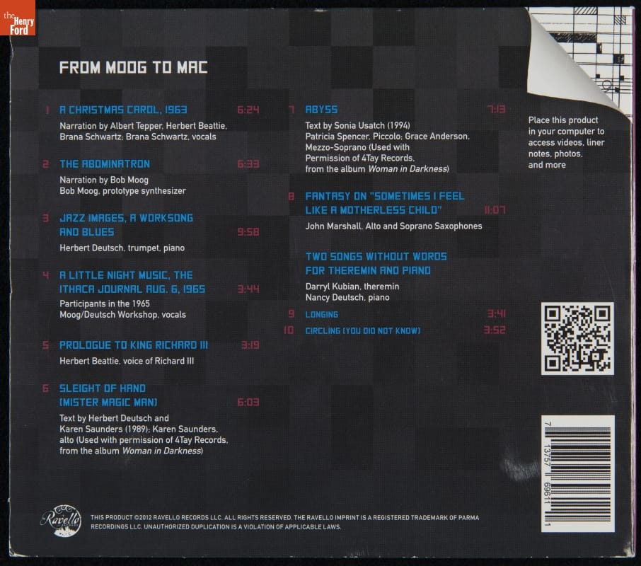 Herbert Deutsch is an experimental composer and was a close collaborator of Robert Moog, inventor of the Moog synthesizer. This disc contains demonstration recordings of the prototype synthesizer, voice correspondence between Moog and Deutsch, and contemporary recordings. "Jazz Images, a Worksong and Blues" was composed on The Henry Ford's 1964 prototype Moog synthesizer--the first song ever composed on the instrument.