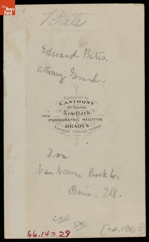 Edward Bates, Attorney-General of the United States under Abraham Lincoln, posed for this carte-de-visite in New York City. The carte-de-visite was a small photographic print on cardboard stock made by professional photographers. People exchanged and collected portrait cartes-de-visite, popular in the United States from the Civil War in the 1860s through the 1880s, to help them remember family and celebrities.