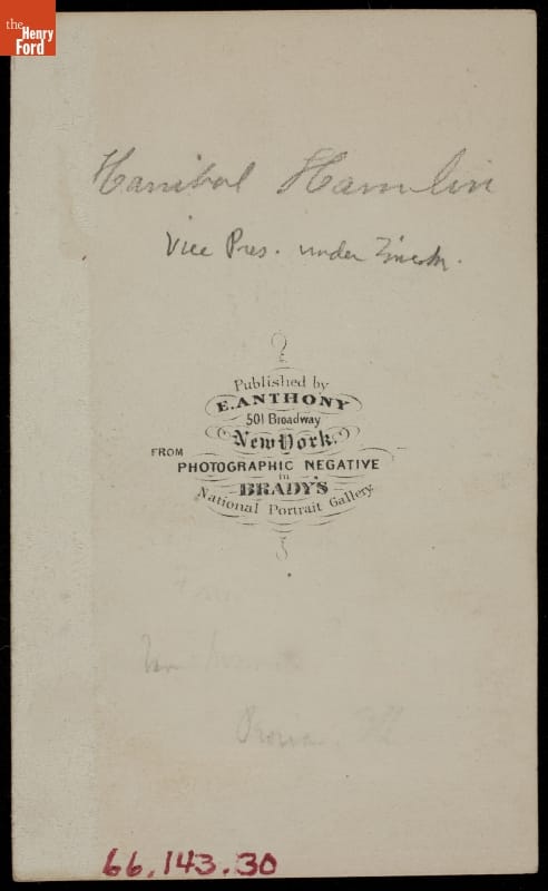 Cartes-de-visite, small, professionally made photographs on cardboard stock, remained popular in the United States from the Civil War in the 1860s through the 1880s. Many were given to friends and loved ones, but enterprising photographers also produced images of famous individuals to sell to the collecting-crazed public. Celebrities, military officers and politicians, such as Vice President Hannibal Hamlin, were popular subjects.