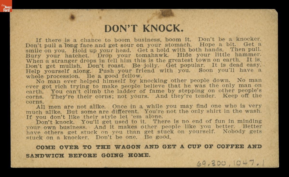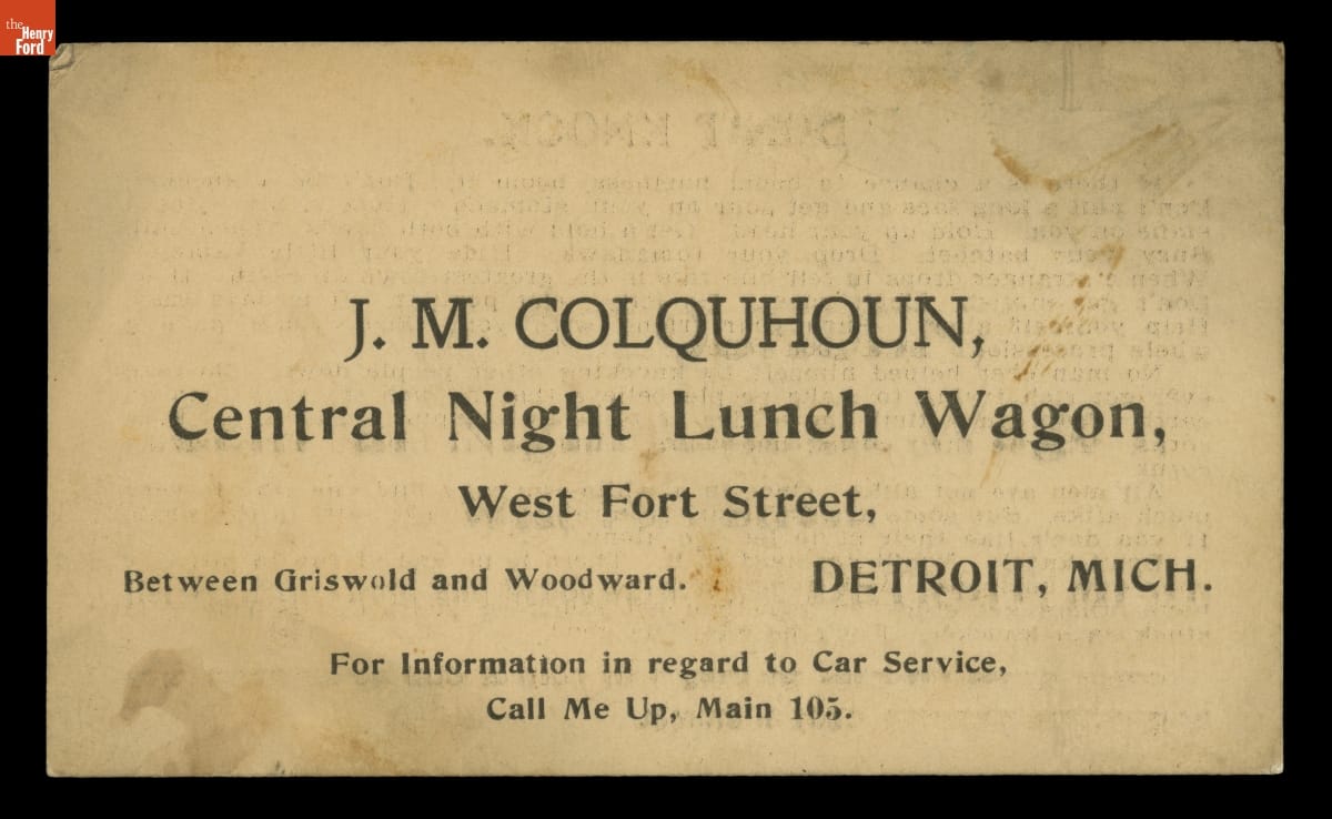 on front: J. M. COLQUHOUN, / Central Night Lunch Wagon, / West Ford Street, / Between Griswold and Woodward. DETROIT, MICH. / For information in regard to Car Service, / Call Me Up, Main 103. on back: DON'T KNOCK [...] COME OVER TO THE WAGON AND GET A CUP OF COFFEE AND SANDWICH BEFORE GOING HOME