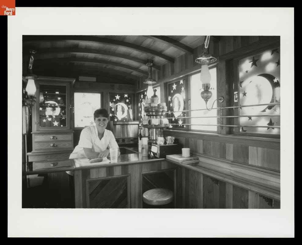 Woman Seated in the Restored Owl Night Lunch Wagon, Greenfield Village, circa 1986