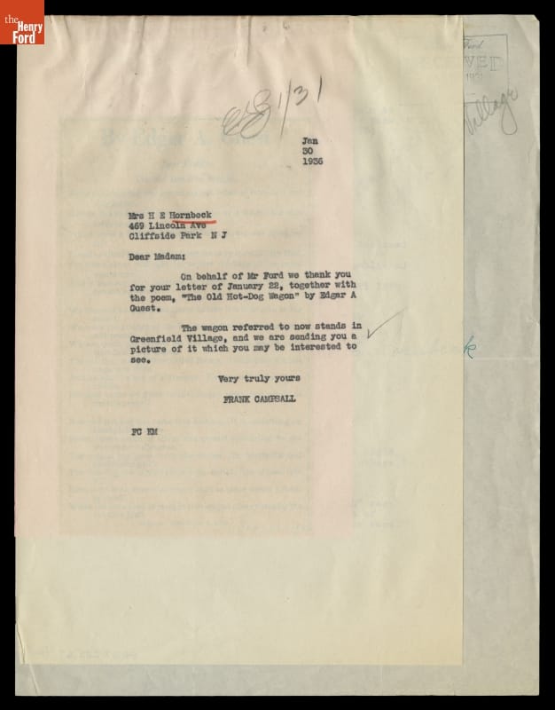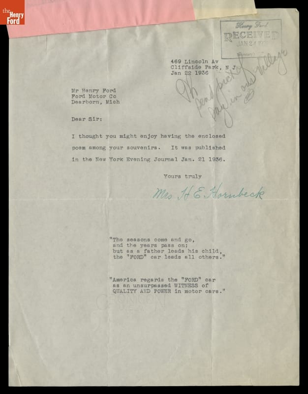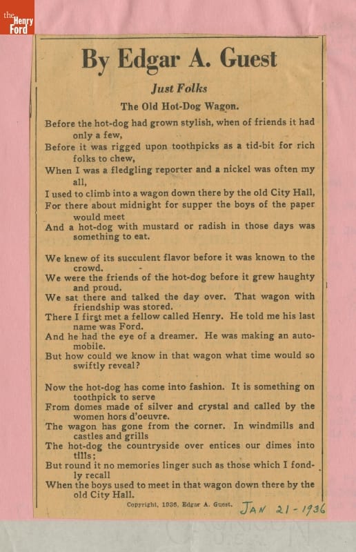 Clipped Poem, "The Old Hot-Dog Wagon," Sent to Henry Ford from Mrs. H. E. Hornbeck, January 1936