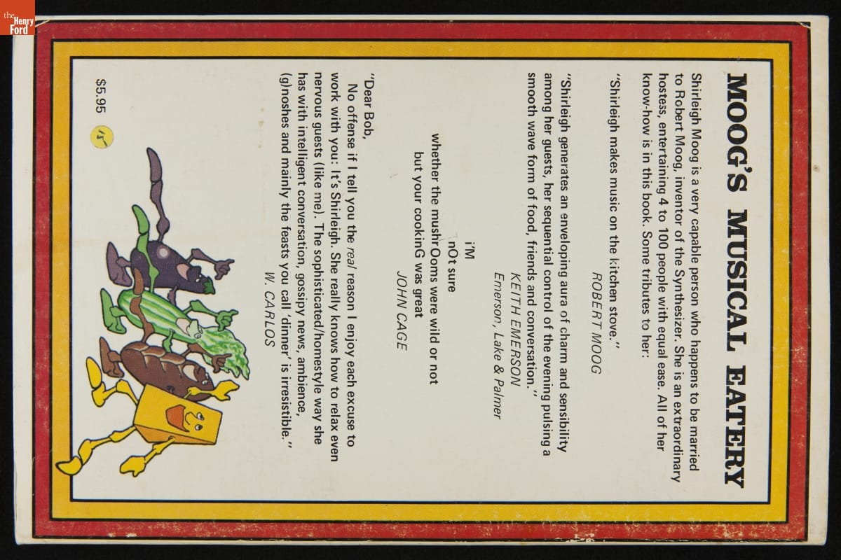This cookbook was written by Shirleigh Moog, the wife of synthesizer innovator Robert Moog. Moog's Musical Eatery, a "cookbook for carefree entertaining," presents the author's "tried and true recipes." These recipes are the result of decades of feeding a family and a "steady stream of musicians and artists" who came to the Moog home.