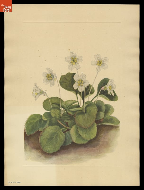 Mary Walcott (1860-1940) captured the beauty of American wildflowers. Born into a well-to-do Quaker family, Walcott collected and illustrated botanical subjects while exploring the Canadian Rockies with her father and brothers. In 1925, the Smithsonian Institution published a five-volume set of her paintings. This photoengraving of Walcott's work was presented to Clara Ford when she became president of the Garden Club of America.
