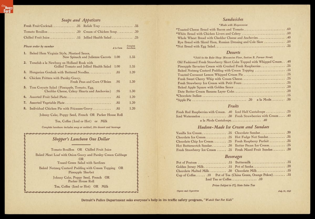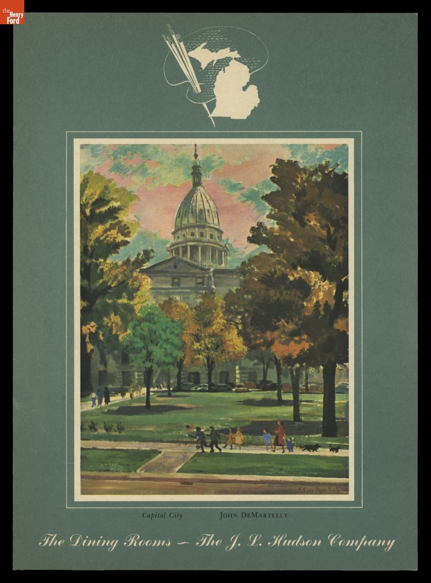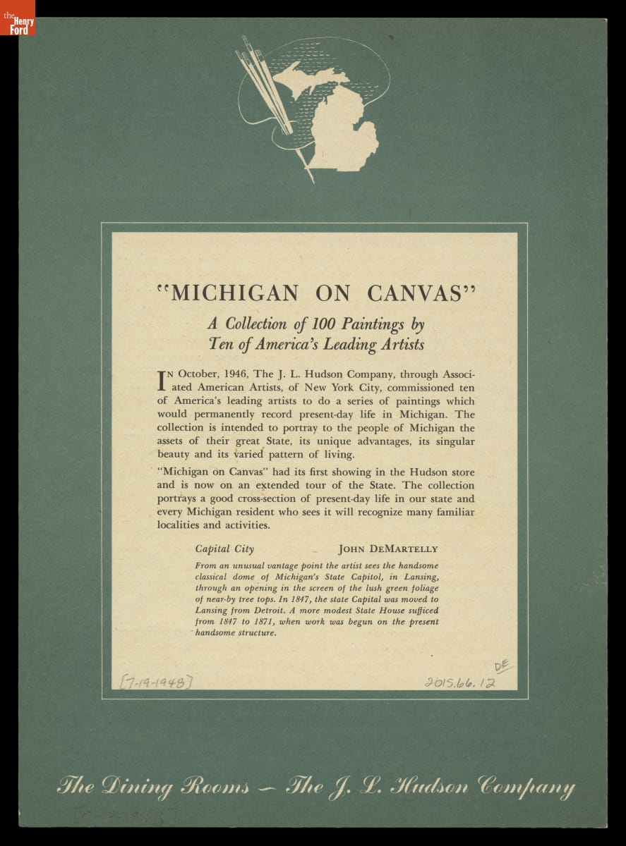 In 1946, the J.L. Hudson Company, a Detroit department store, commissioned ten American artists to create works that portrayed the people and places of Michigan. A committee selected 95 paintings that toured the state in the exhibition "Michigan on Canvas." J.L. Hudson also reproduced selected works for the covers of menus used in its Detroit flagship store's dining rooms.