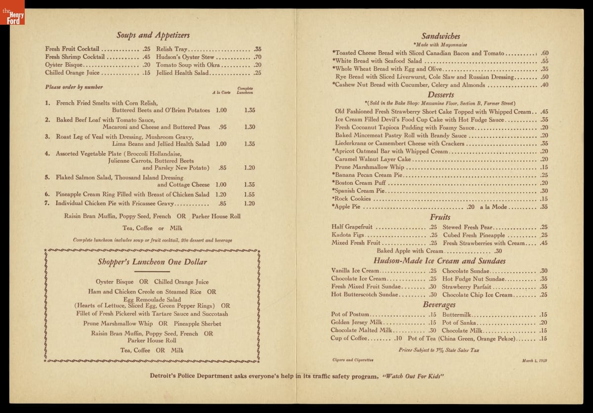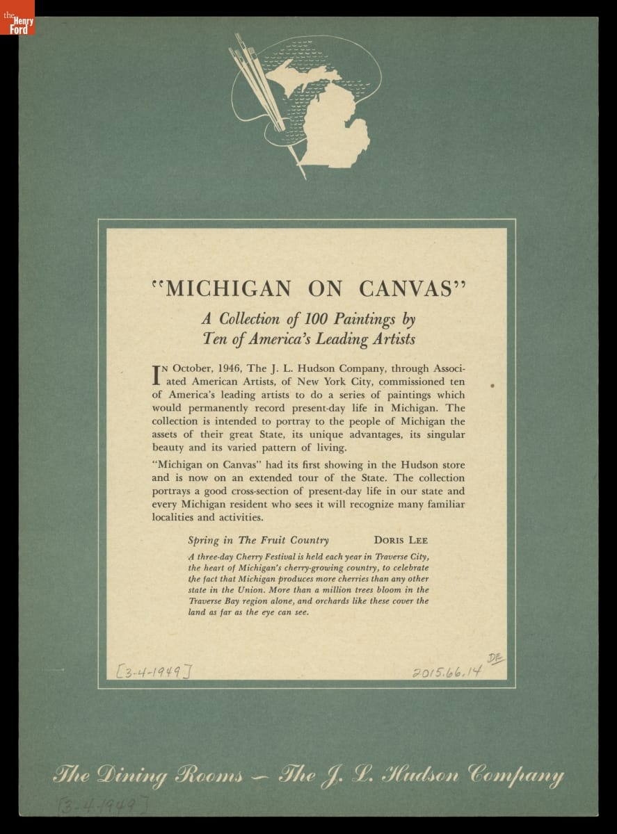 In 1946, the J.L. Hudson Company, a Detroit department store, commissioned ten American artists to create works that portrayed the people and places of Michigan. A committee selected 95 paintings that toured the state in the exhibition "Michigan on Canvas." J.L. Hudson also reproduced selected works for the covers of menus used in its Detroit flagship store's dining rooms.