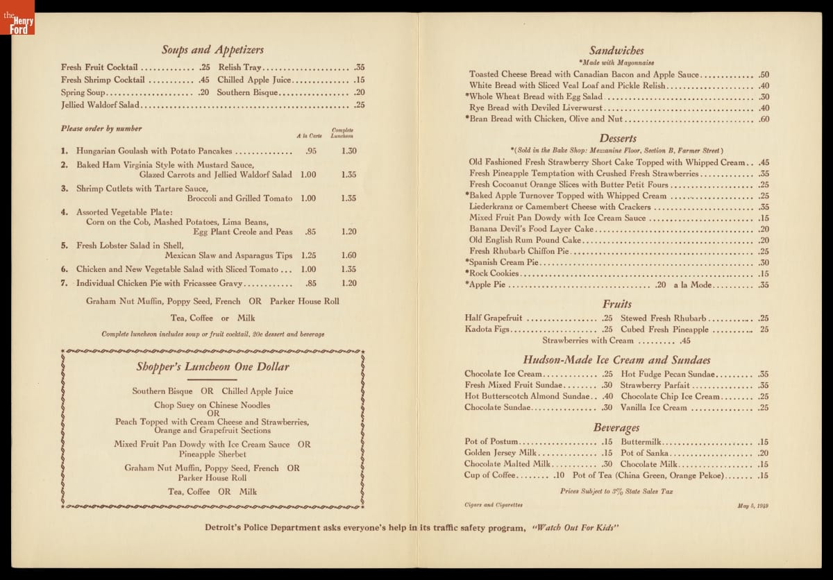 "The Dining Rooms - The J.L. Hudson Company" Menu Showing "Mending Row," 1949