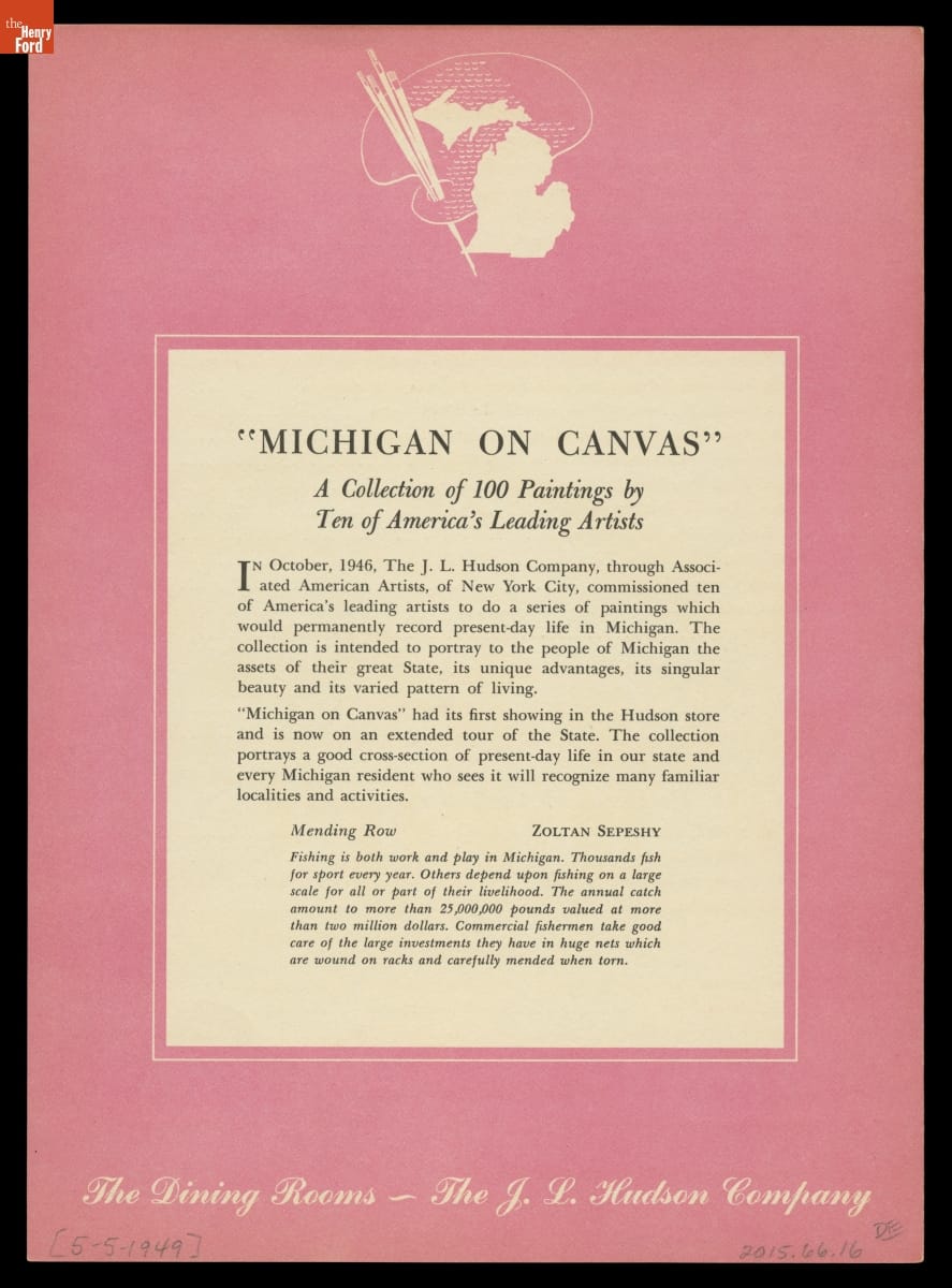 In 1946, the J.L. Hudson Company, a Detroit department store, commissioned ten American artists to create works that portrayed the people and places of Michigan. A committee selected 95 paintings that toured the state in the exhibition "Michigan on Canvas." J.L. Hudson also reproduced selected works for the covers of menus used in its Detroit flagship store's dining rooms.
