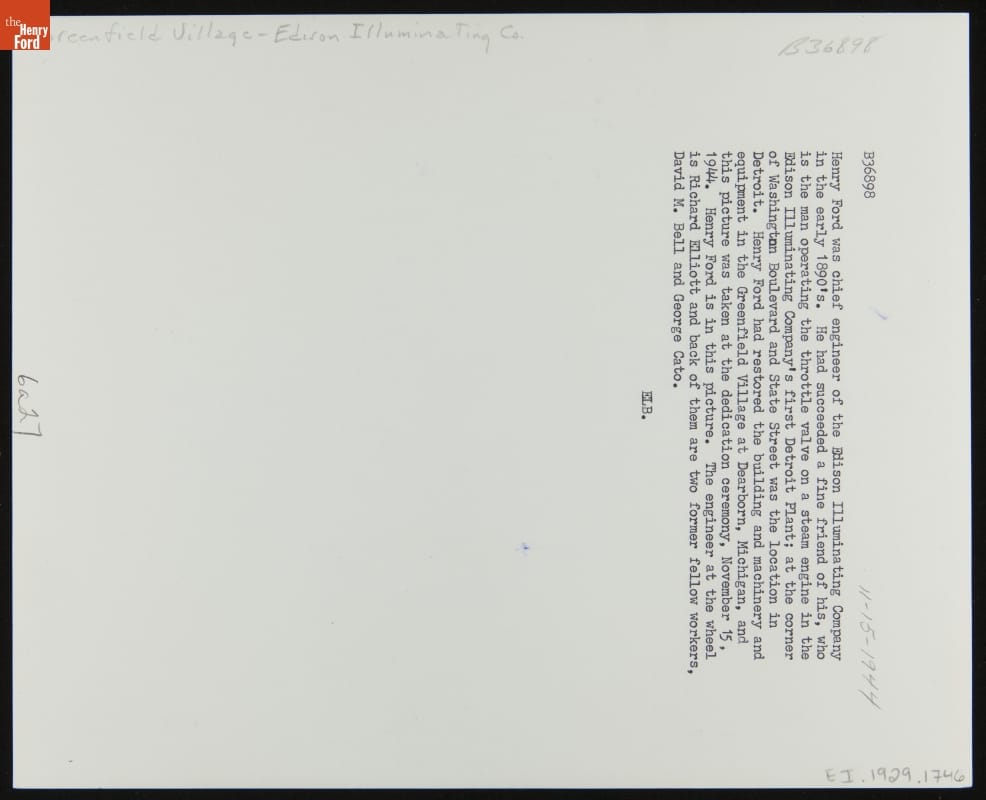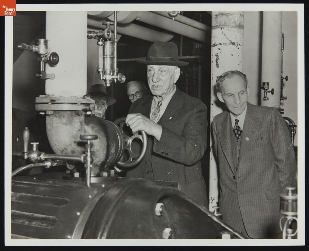 Henry Ford constructed an edited, scaled-down version of the Detroit power plant where he worked as chief engineer in the 1890s. Former Edison Illuminating Company coworkers attended the November 1944 dedication in Greenfield Village. Among the guests was Richard Elliot, the chief engineer who preceded Ford at the plant. Here, Elliot operates the steam engine's throttle valve with his friend standing nearby.
