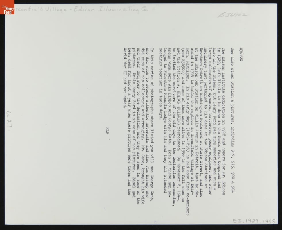 In 1944, Henry Ford constructed an edited, scaled-down version of the Detroit power plant where he had worked as chief engineer in the 1890s. Ford invited former Edison Illuminating Company coworkers to the November dedication in Greenfield Village.
