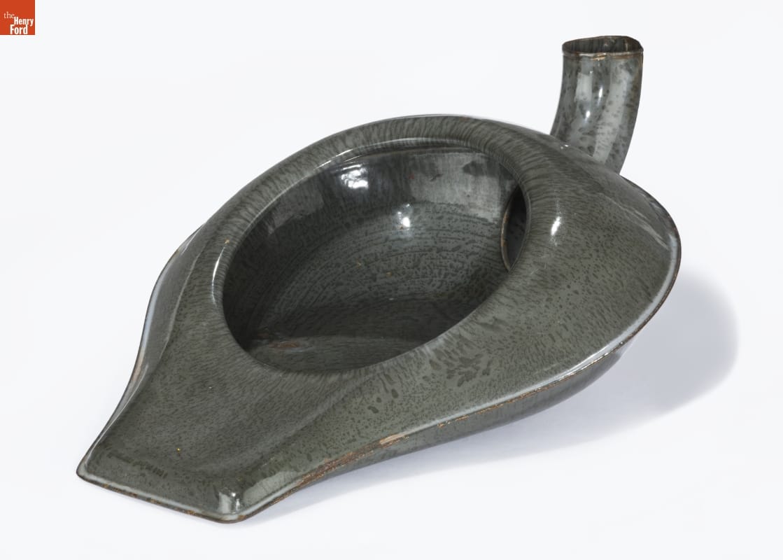 When enamel-coated ironware was introduced in 1874, manufacturers marketed its durability and handsome mottled gray surface--the origin of its common name, "graniteware." Graniteware was also more lightweight than cast iron and would not rust or corrode, like tinware. Consumers could choose from a wide range of graniteware products, including cookware and other household items, like this bedpan.