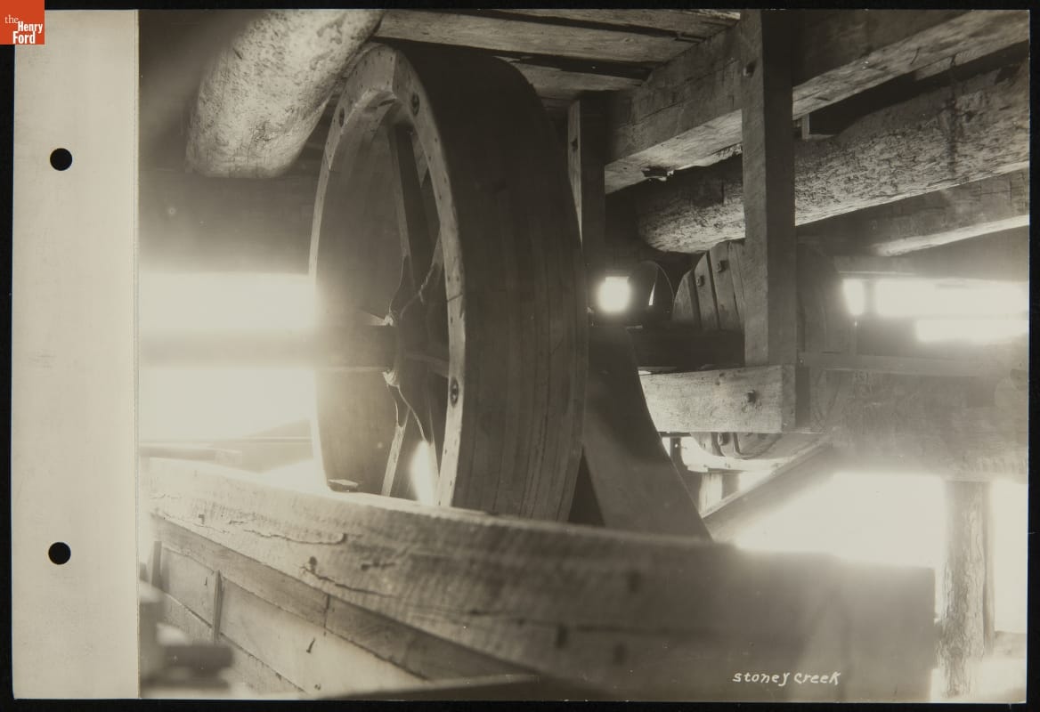 Loranger Gristmill was built in 1832 on Stoney Creek in Monroe, Michigan. It incorporated a sophisticated conveyor system, developed by Oliver Evans in the late 1700s, that moved grain through the building to be ground into flour or animal feed. In the late 1920s, after the mill had ceased operation, Henry Ford purchased it. Ford sent his staff to document the structure before its relocation to Greenfield Village.