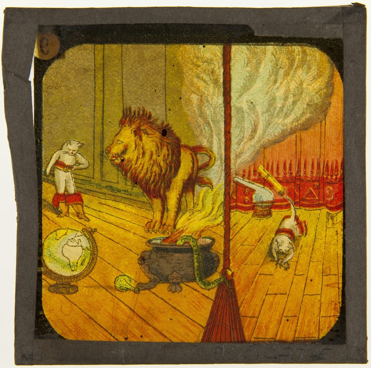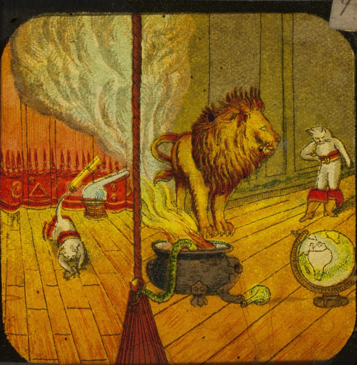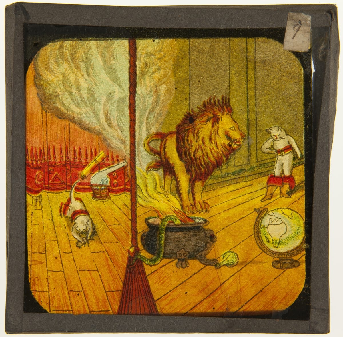 Magic lanterns use a concave mirror and light source to project images on glass slides with painted or photographic scenes. Developed in the 17th century, magic lanterns predate slide projectors and motion pictures. In the hands of magicians, they became "lanterns of fright," projecting wondrous images and apparitions. Slide themes ranged widely: exotic travel, folklore, advertising, history, science, and art.