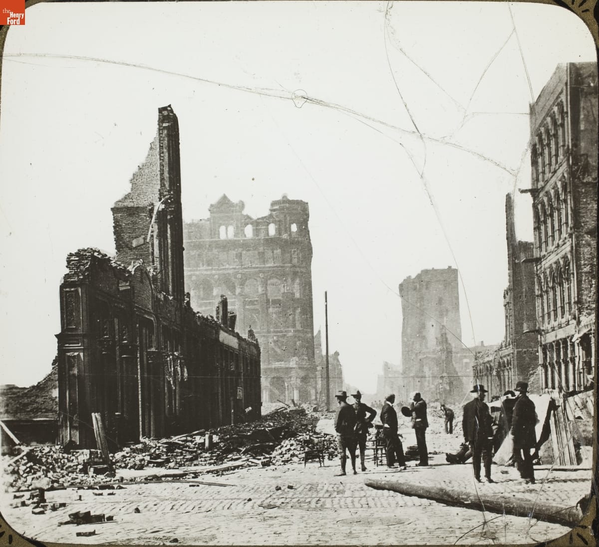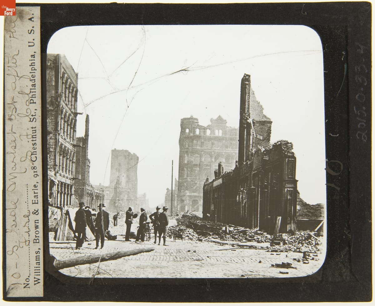 On April 18, 1906, San Francisco and the northern California coast were hit by a major earthquake with an estimated magnitude of 7.9. Following the earthquake, ruptured gas lines fed fires that destroyed some 25,000 buildings in the city. More than 3,000 people were killed and San Francisco was devastated. This lantern slide documents some of the damage.