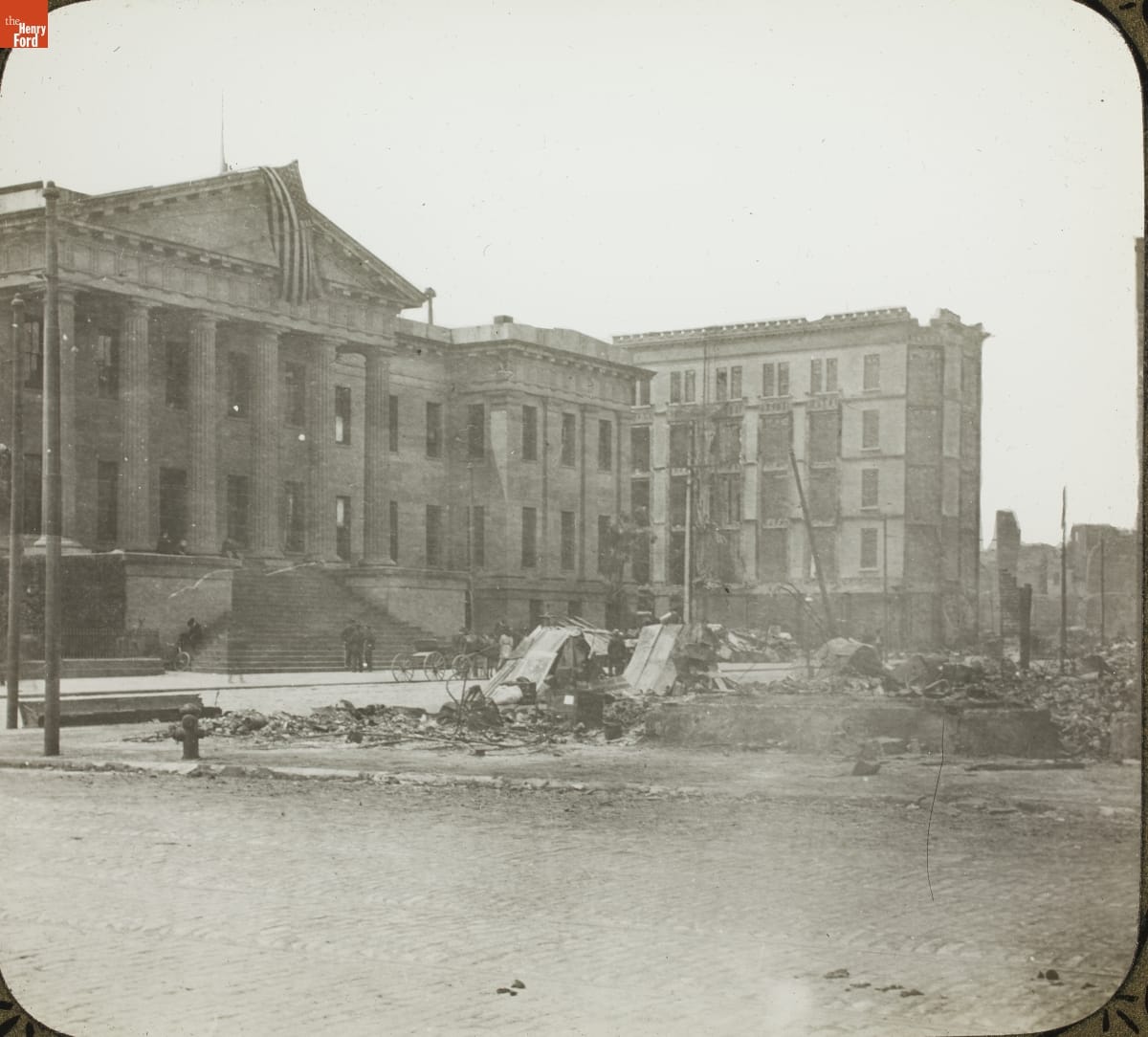 On April 18, 1906, San Francisco and the northern California coast were hit by a major earthquake with an estimated magnitude of 7.9. Following the earthquake, ruptured gas lines fed fires that destroyed some 25,000 buildings in the city. More than 3,000 people were killed and San Francisco was devastated. This lantern slide documents some of the damage.