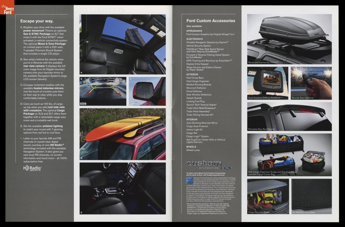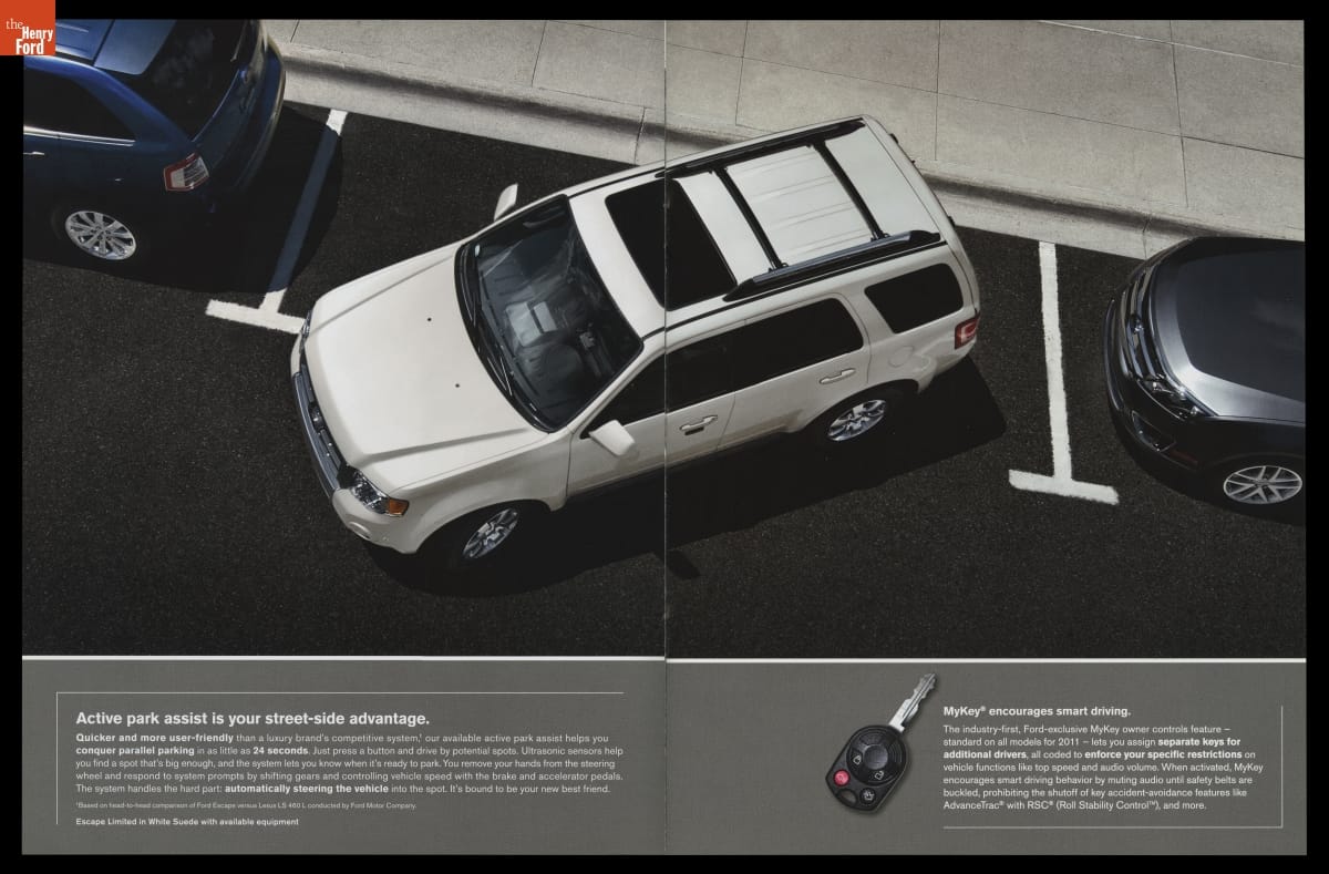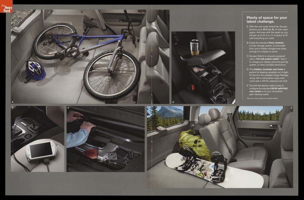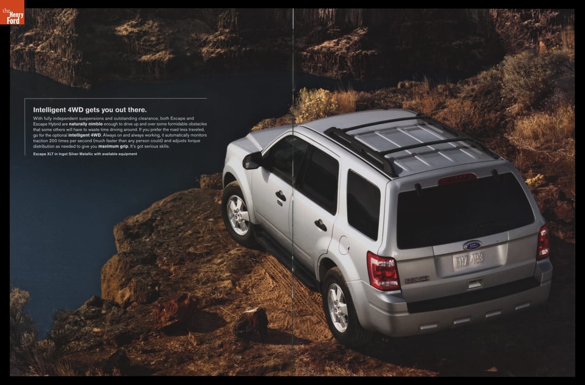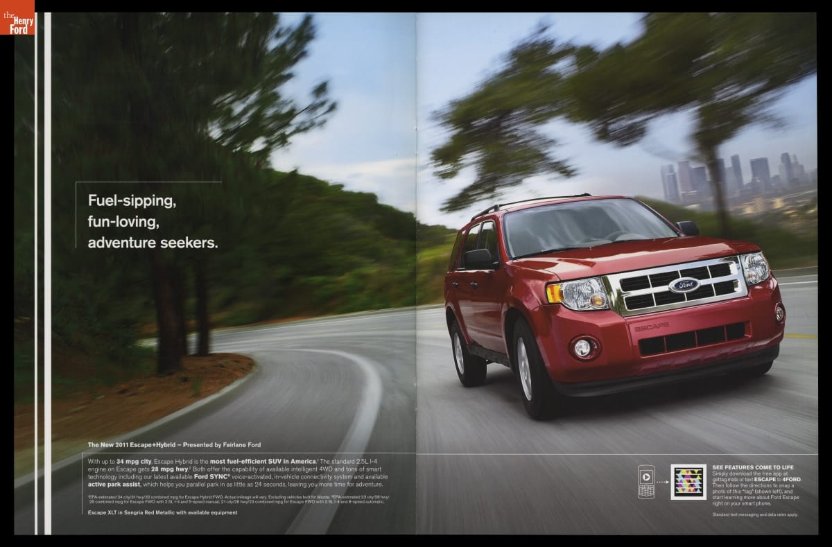 Ford introduced the Escape for 2001. It represented the growing trend toward crossover vehicles combining elements of an SUV and a traditional sedan. For 2004 Ford offered a hybrid gas-electric Escape -- the company's first hybrid vehicle. This brochure promoted the 2011 Ford Escape Hybrid, which boasted a city fuel economy rating of up to 34 miles per gallon.