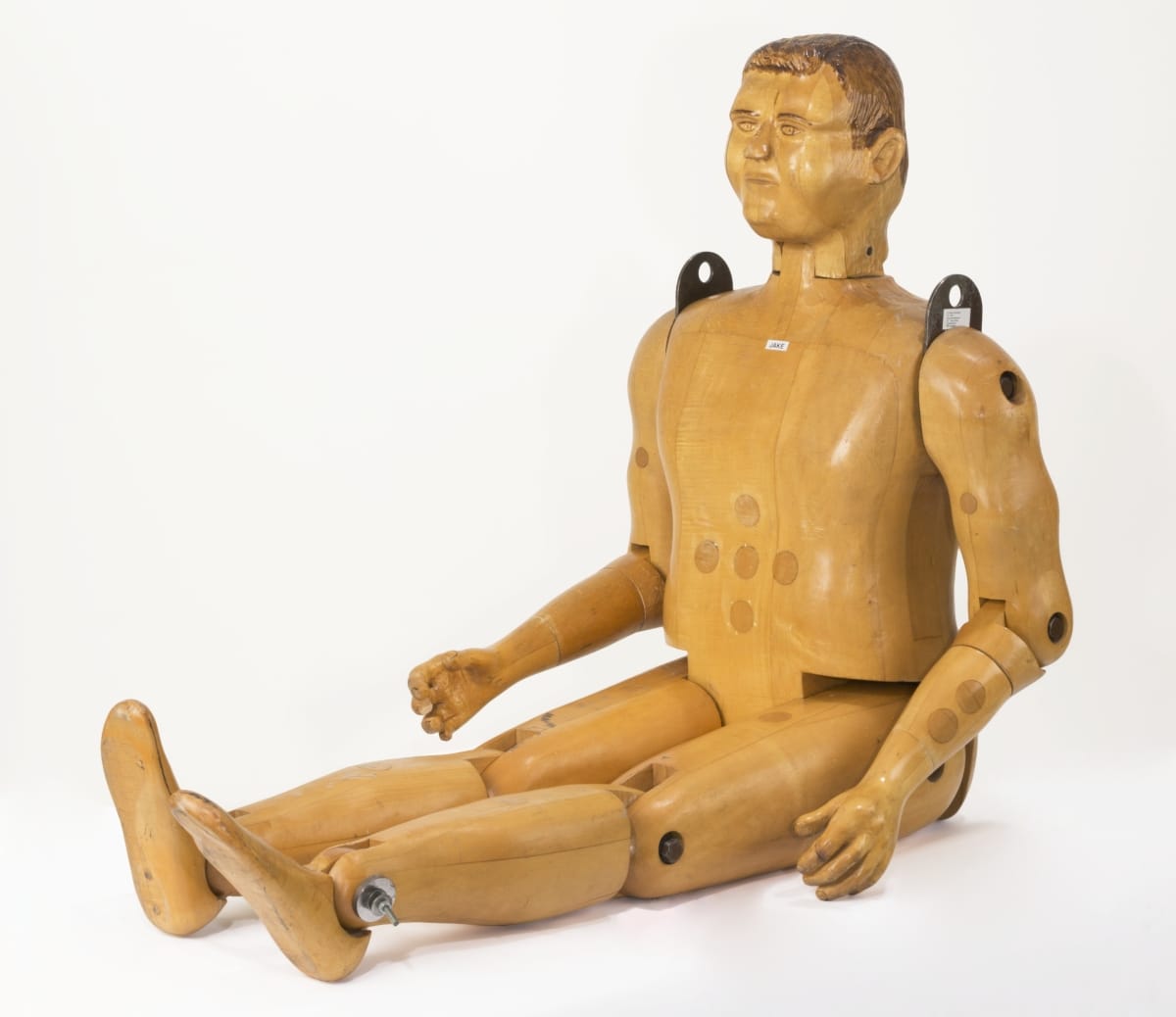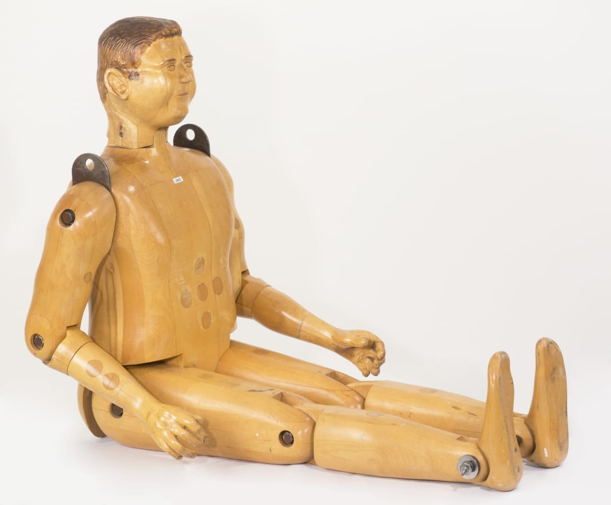 During the 1980s, La-Z-Boy -- like other manufacturers of the time -- embraced new production technologies and testing standards. The company, known for its comfortable reclining chairs, opened a testing facility that became home to this carved maple figure. In response to the new science of ergonomic, "Jake" tested chairs for durability and support.