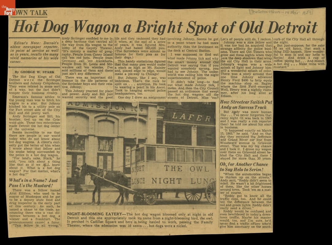 Detroit News Clipping from March 14, 1954, "Hot Dog Wagon a Bright Spot of Old Detroit"