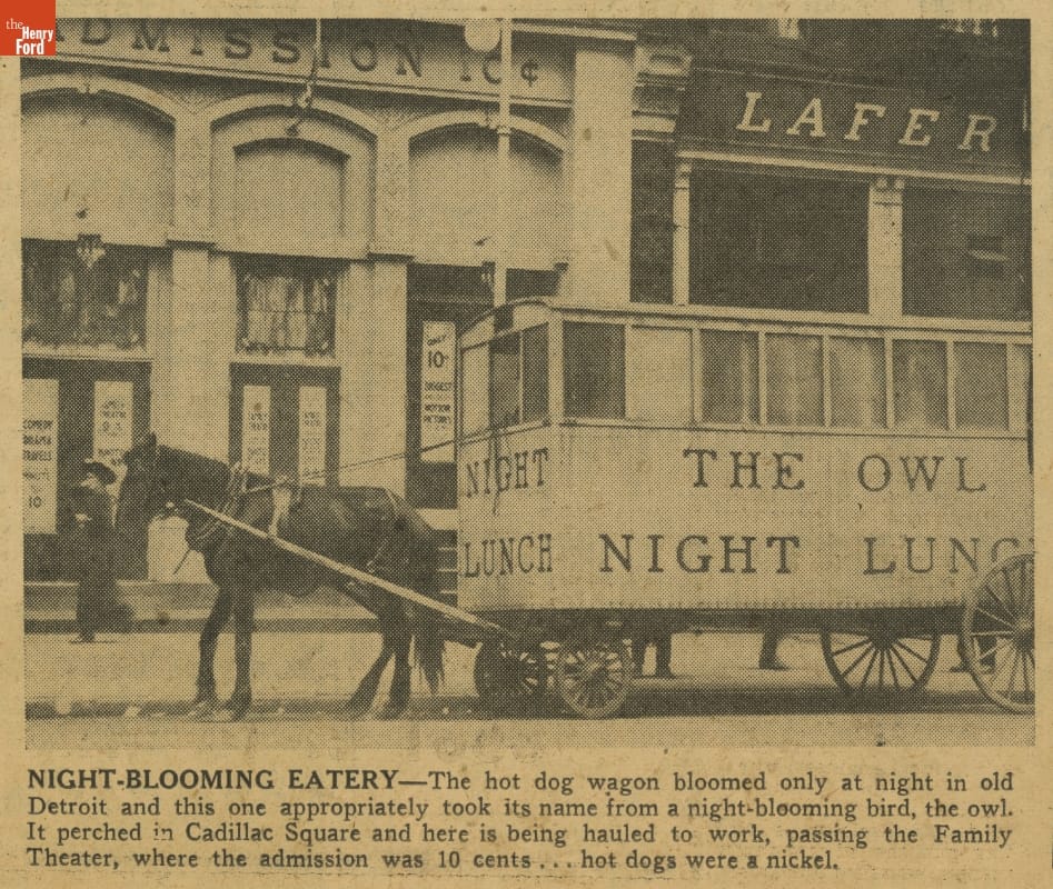 Night lunch wagons became popular in the 1890s. These horse-drawn "restaurants on wheels" served simple, affordable food like hot dogs after regular restaurants closed for the night. The Owl Night Lunch wagon pictured here operated in Detroit until 1926, when a city ordinance banned lunch wagons. Henry Ford, who had patronized the Owl as a young engineer, acquired it for Greenfield Village in 1927.