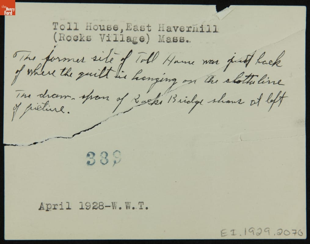This photograph shows the Rocks Village Toll House located near Haverhill, Massachusetts. Just as private ferry operators carried early travelers across rivers, many early bridges were built and operated as private businesses, and travelers paid tolls to cross them. Workers at this toll house collected fares for a bridge across the Merrimack River.