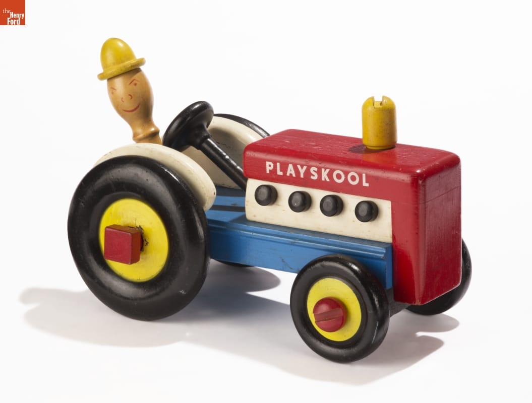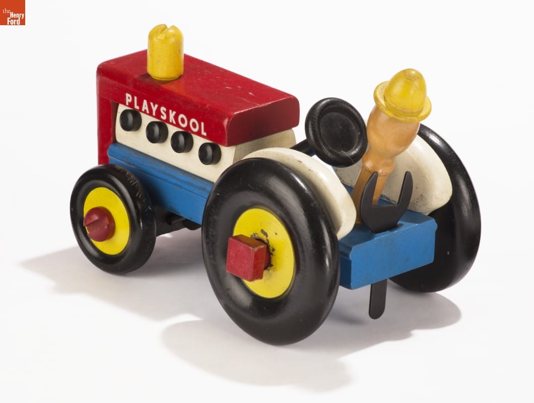 A large, sturdy take-apart tractor with a steering mechanism that turns the front wheels. The driver is a screw driver and the seat a wrench, both of which enable child to remove the wheels, fenders, axles, radiator, air intake, and motor from the frame. 20 pieces.