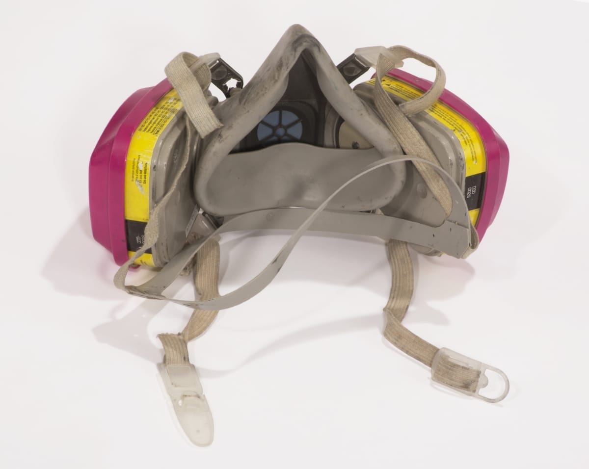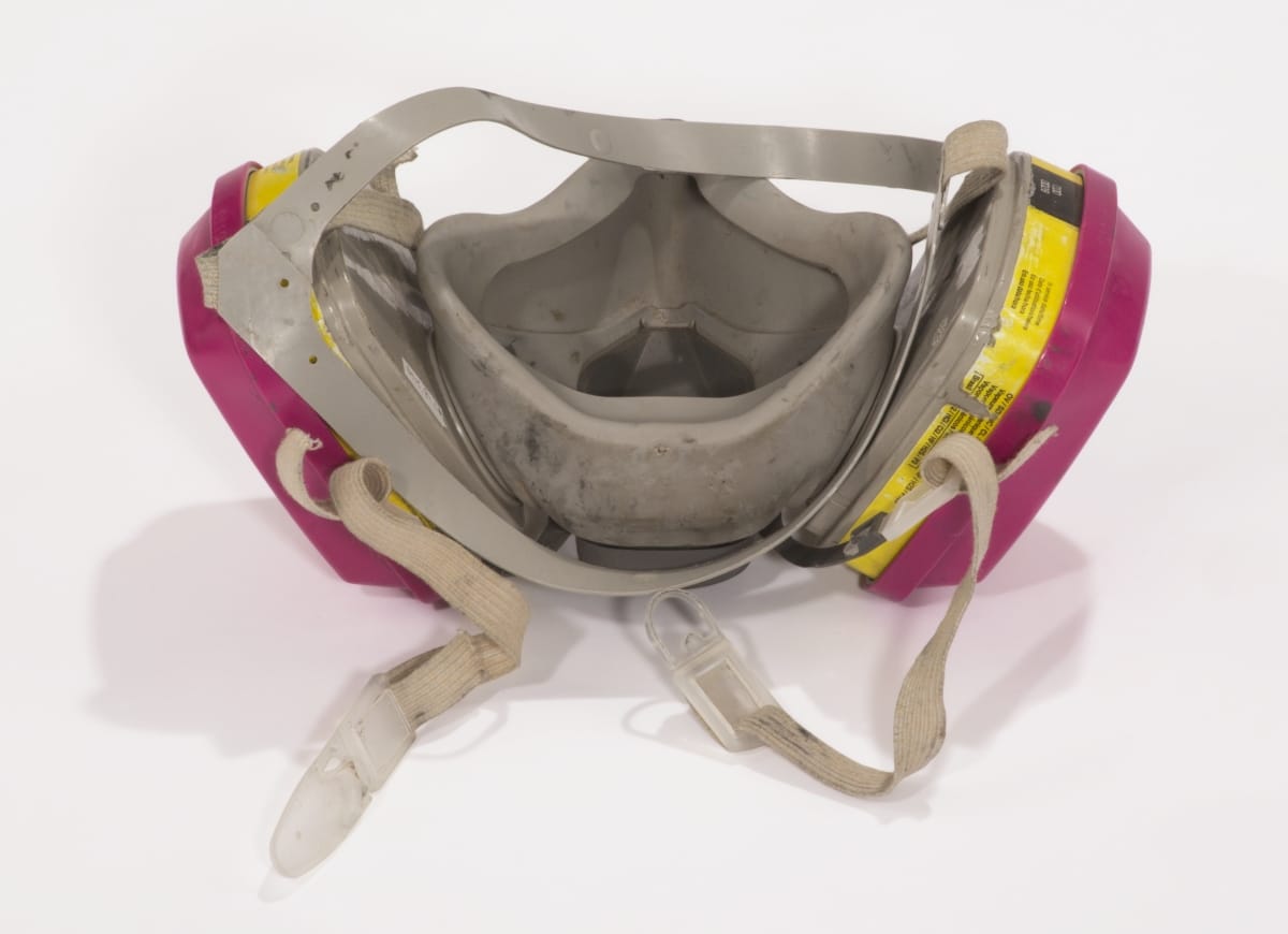 on respirator, on yellow stickers: