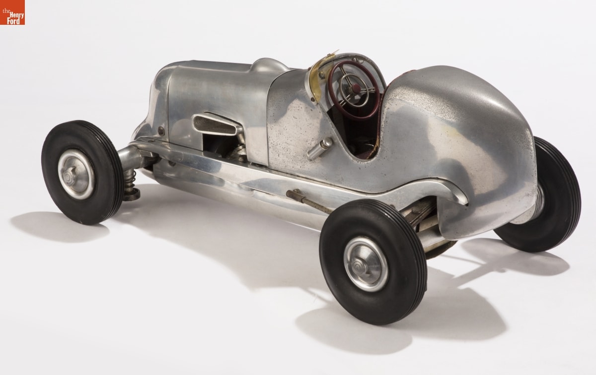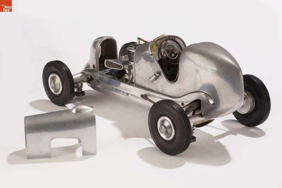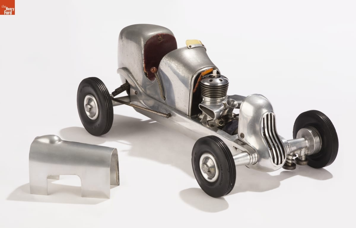 Tether cars, gas-powered model race cars, were popular in the 1930s and 1940s. They were raced individually while tethered to a central pivot, or against each other on a scaled-down board track. This model, with its cast aluminum body and sheet aluminum bellypan, was a product of the Gardner Welsh Engineering Company of Eagle Rock, California.