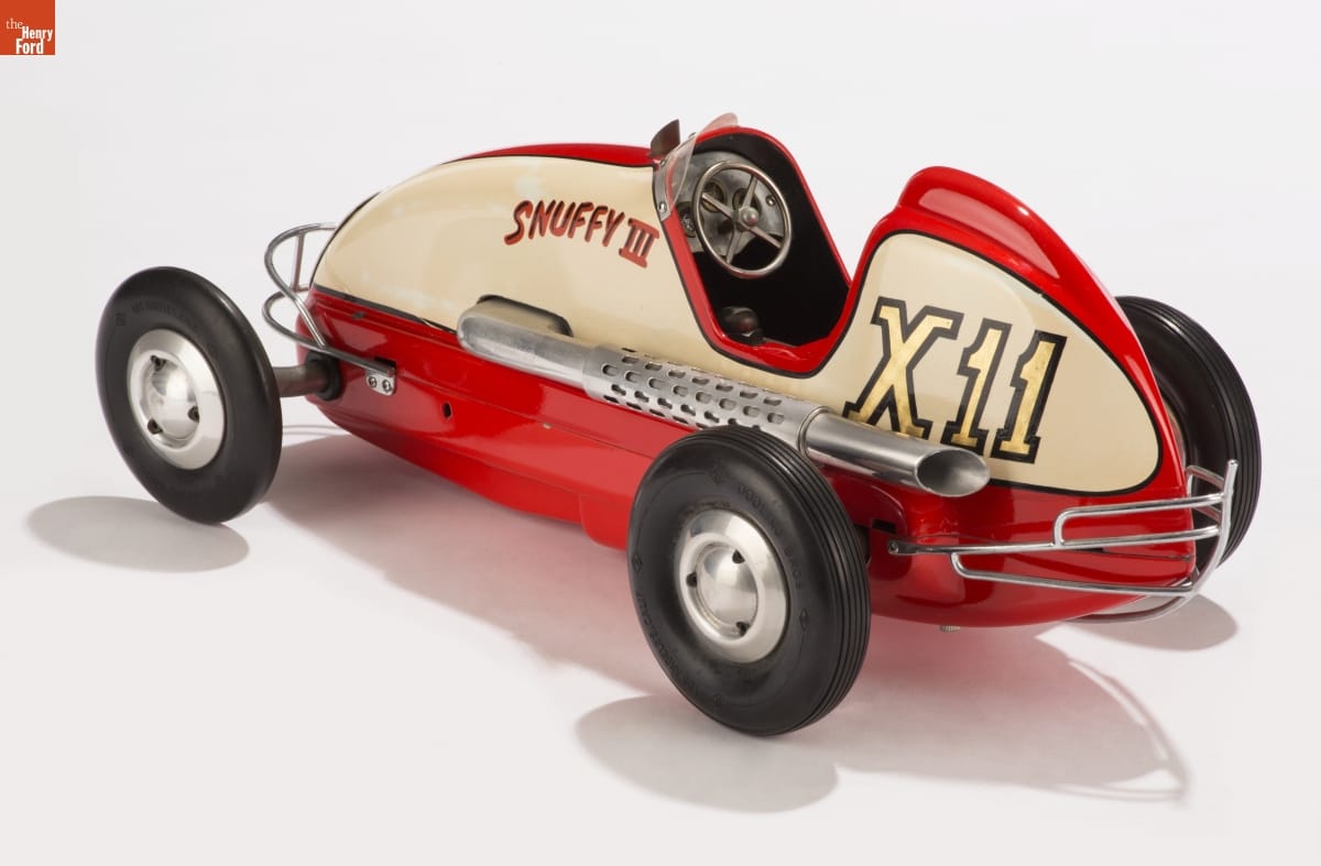 Tether cars, gas-powered model race cars, were popular in the 1930s and 1940s. They were raced individually while tethered to a central pivot, or against each other on a scaled-down board track. Frank Robertson won several trophies from the American Miniature Racing Car Association. This car, which Robertson named "Snuffy III," is an Indianapolis-style racer.