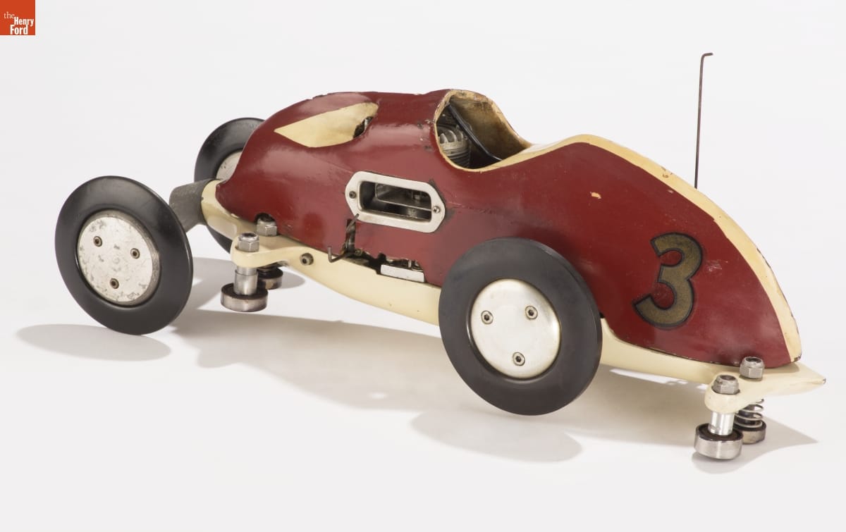 Tether cars, gas-powered model race cars, were popular in the 1930s and 1940s. They were raced individually while tethered to a central pivot, or against each other on a scaled-down board track. Frank Pawlikowski won two national championships and one international championship with this car in the late 1940s. The car was undefeated in three years.