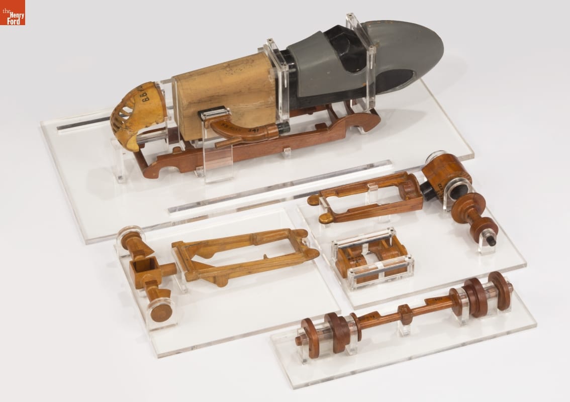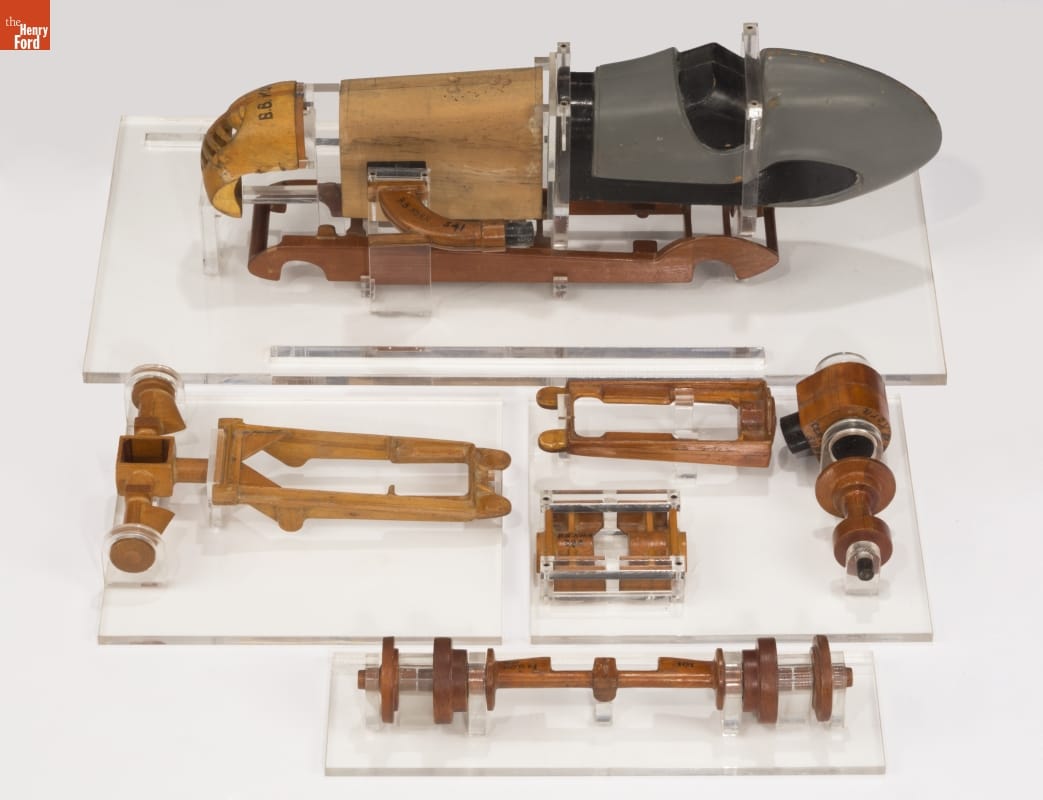 Tether cars, gas-powered model race cars, were popular in the 1930s and 1940s. Barney Korn was among the most skilled builders. While his models weren't particularly fast, they were exceptionally detailed. Korn even built model cars, boats, and airplanes for Hollywood movies. He used these wood patterns to create some of his tether cars.