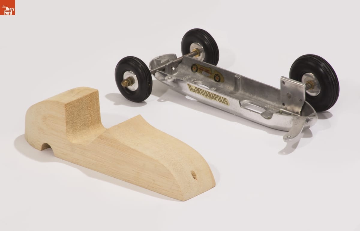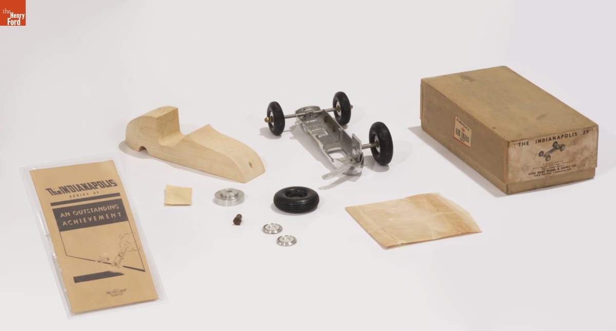 Tether cars, gas-powered model race cars, were popular in the 1930s and 1940s. Barney Korn was among the most skilled builders. This unassembled kit is for one of Korn's "Indianapolis 29" models. Note that the buyer had to finish the rough edges of the balsa wood body and purchase the .29-cubic-inch engine separately.