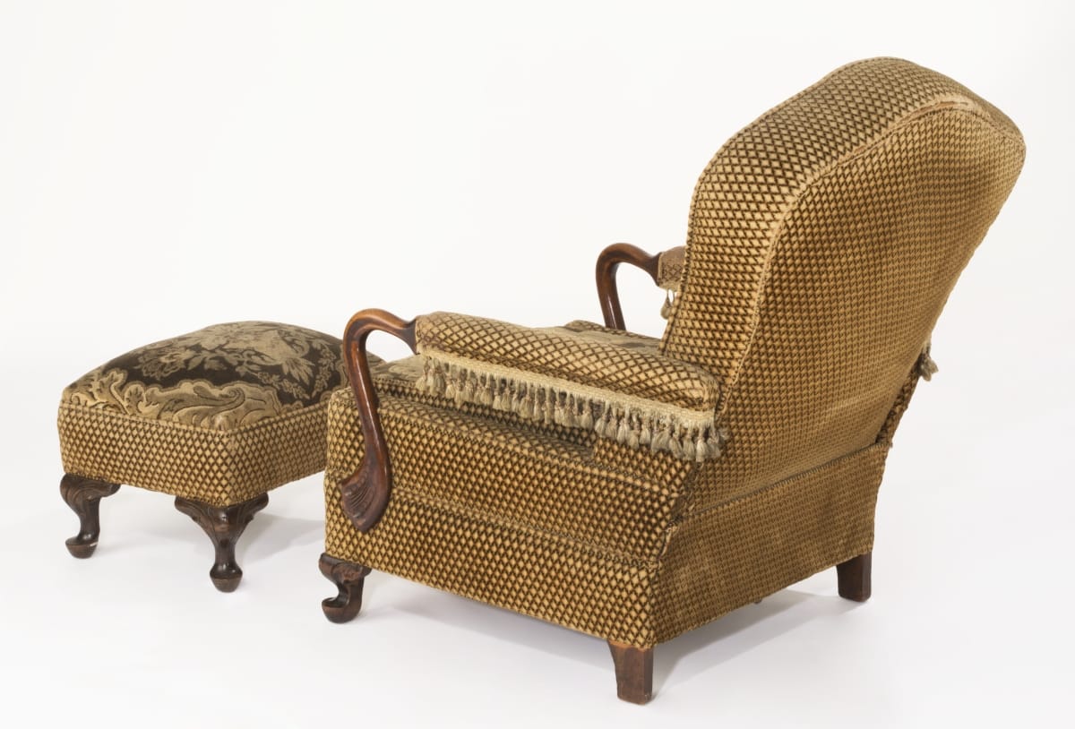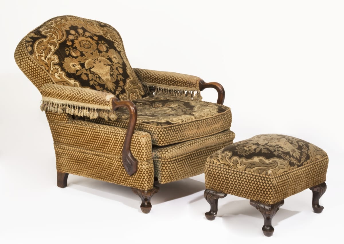 This reclining chair was one of the first upholstered chairs produced by La-Z-Boy co-founders Edwin Shoemaker and Edward Knabusch. The earliest La-Z-Boys featured a patented reclining system and included a separate ottoman. Later technical refinements would produce a built-in footrest, eliminating the need for an ottoman and leading to the modern La-Z-Boy recliner.