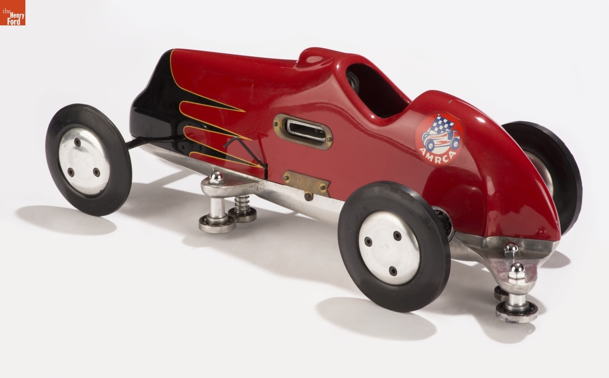 Tether cars, gas-powered model race cars, were popular in the 1930s and 1940s. They were raced individually while tethered to a central pivot, or against each other on a scaled-down board track. This model is one of a small batch built by George Riff of Chicago. The "AMRCA" decal, on the car's rear left, was for the American Miniature Racing Car Association.