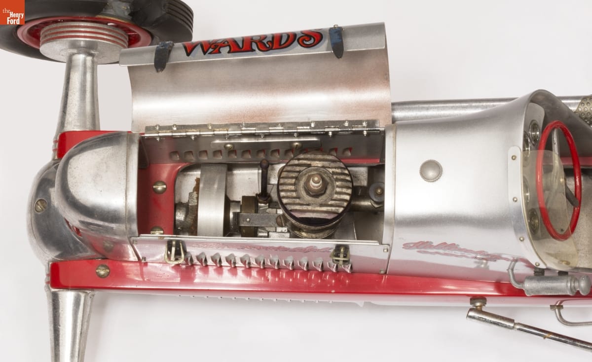 Tether cars, gas-powered model race cars, were popular in the 1930s and 1940s. They were raced individually while tethered to a central pivot, or against each other on a scaled-down board track. This model is one of five to ten "Bullnose" type tether cars produced by the Gardner Welsh Engineering Company. It features a cast aluminum body and nose.