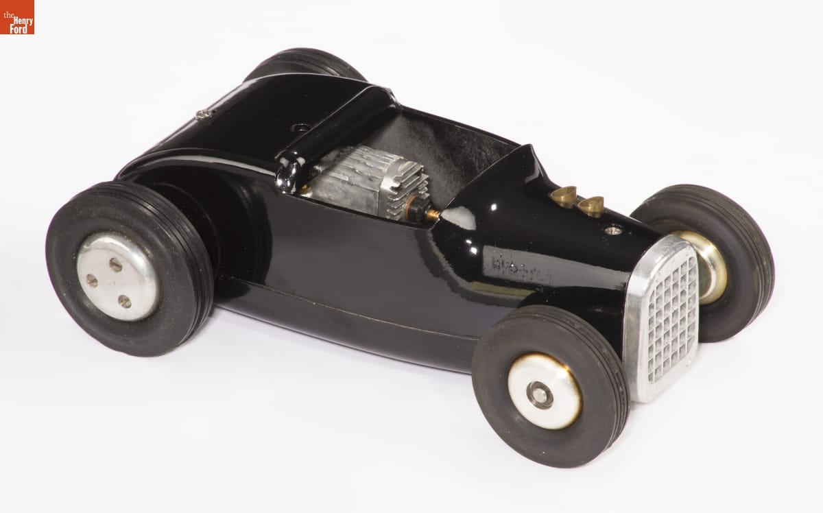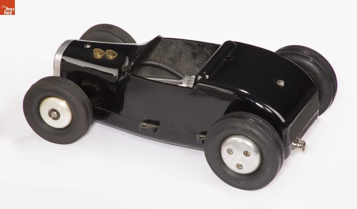 Tether cars, gas-powered model race cars, peaked in popularity during the years surrounding World War II. They were raced individually while tethered to a central pivot, or against each other on a scaled-down board track. Cars could be scratch-built, put together from model kits or purchased fully assembled. This Rodzy model was designed to resemble a Ford Model A hot rod.