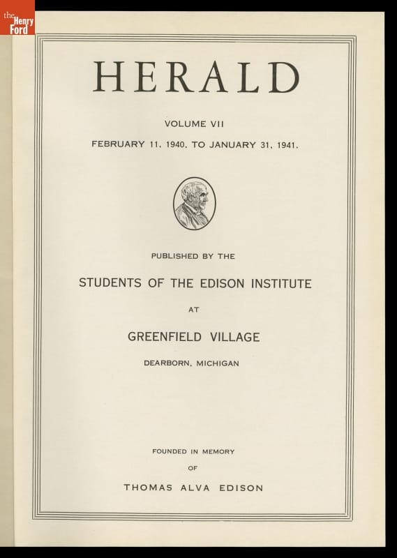HERALD / VOL VII / FEBRUARY 11, 1940 TO JANUARY 31 1941 / PUBLISHED BY THE STUDENTS OF THE EDISON INSTITUTE / AT GREENFIELD VILLAGE / DEARBORN, MICHIGAN / FOUNDED IN MEMORY / OF / THOMAS ALVA EDISON